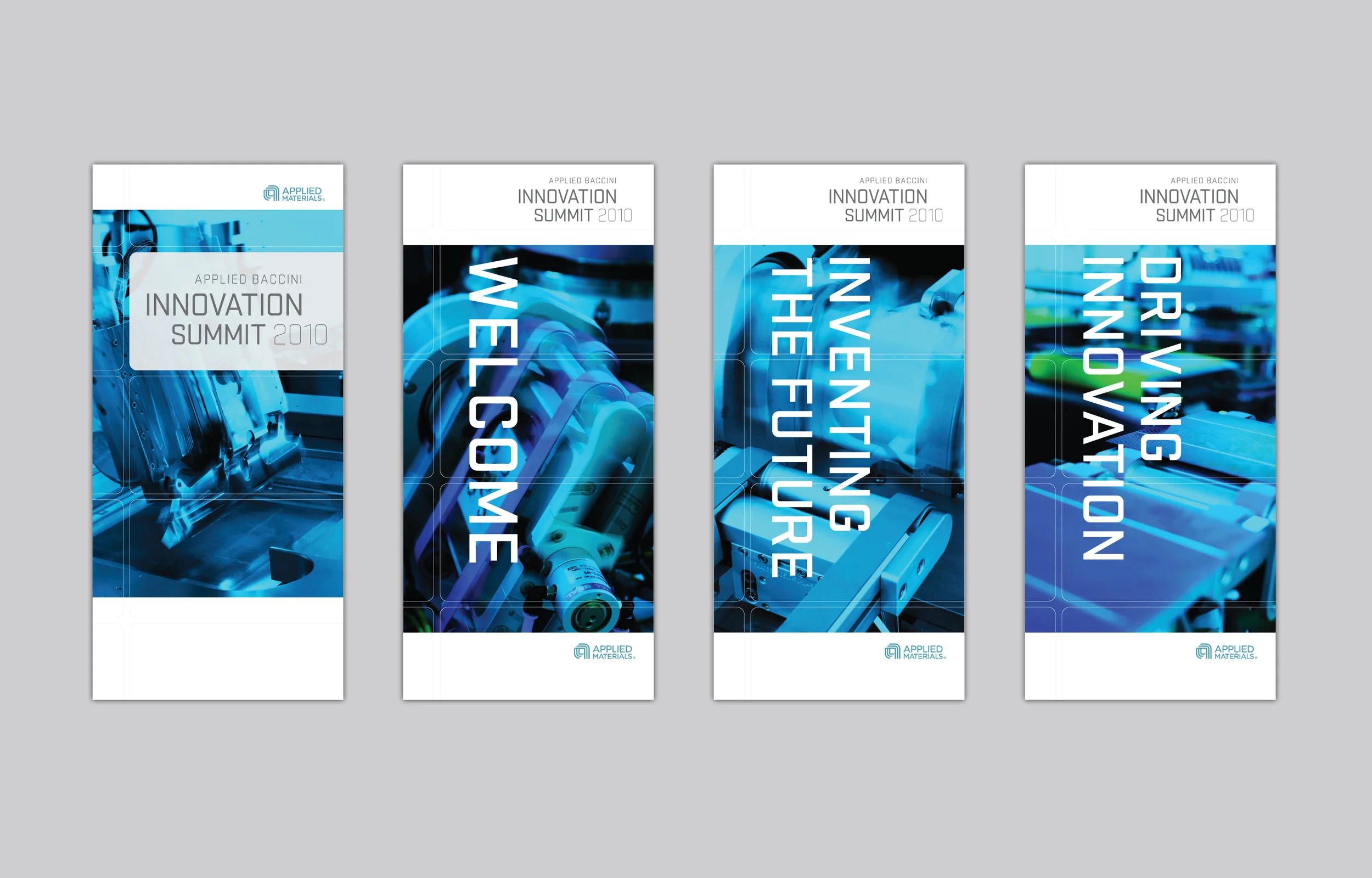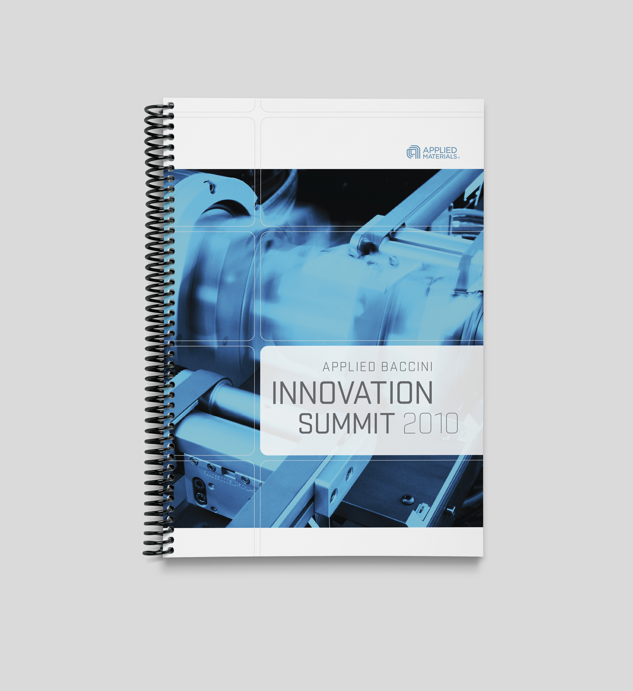 In 2010, we developed a visual and verbal theme for the Applied Baccini Innovation Summit to be held in its facilities in Treviso, Italy. The challenge was to make the visual style unique to Treviso, but also similar to the other events hosted elsewhere in the world. We developed logos and smart wayfinding signage to direct attendees through the R&D facility. With a vibrant and robust theme, a complex industrial building was converted into a captivating display of Applied Materials technology.